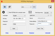 Company: First International Soft Country: United States of America, Texas, Houston ASP member: No Company Web site: http://fisoft.all-softwares.com/aboutus.php Site of program: http://windows.en.all-softwares.com/kisskey-keylogger-for-windows-8.php Application info: http://windows.en.all-softwares.com/kisskey-keylogger-for-windows-8.php Author: Antonin Rush Sales email: allsoftwaresweb@gmail.com Support email: allsoftwaresweb@gmail.com License type: Shareware Class: Security & Privacy::Covert Surveillance Specific: Utilities Categories: Security Tools :: Key Loggers, Antivirus Firewall & Spyware :: Monitoring Software Platform: Windows OS: Win2000, WinXP, Win7 x32, Win7 x64, Windows 8, WinServer, WinOther, WinVista, WinVista x64 System requirements: Windows XP Language: English Limitations: Logs are emailed manually. Periodic popup shown with character count.