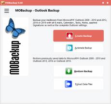 Keywords: Outlook Backup, 2019, 2016, 2013, 2000, XP, 2003, 2007, 2010, Microsoft, Notes, Contacts, Calendar, emails, Backup E-mails, Inbox, pst, RSS-Feeds, Accounts, Alerts, Rules, POP3, Windows, Signatures, Browser Bookmarks, OneNote Do you use Microsoft Outlook? Do you manage your complete E-mail communication, your calendar and contacts with Outlook? Backup your sensitive E-mail data from Microsoft Outlook regularly and restore it to your system in case of need. Nothing's more annoying than lost data and contacts. MOBackup - Data backup for Microsoft Outlook 2000 to Outlook 2019 is a backup solution for archiving of your E-mails, Calendar, Contacts, Rules, Signatures, etc... MOBackup also backs up the Favorites and Bookmarks for the Windows Browser Internet Explorer, Mozilla Firefox, Opera, Vivaldi und Google Chrome. The implemented auto-save routine enables you to save your data completely automated. Do you need to move your data from one computer to another for technical reasons? Then you can transfer your complete Microsoft Outlook data to the new system by using 1:1 Restore feature. Thereby all Outlook program settings, like E-mails, Contacts, Notes, Journal, Tool Bars, Printer Settings, POP3 Settings, RSS-Feeds, etc. will be restored as well. Additionally MOBackup saves and restores the Opera Notes, Addresses and Widgets, the Internet Explorer Security Zones, the Bookmarks of Edge, Firefox, Vivaldi and Chrome, the Office AutoCorrect Lists and Settings and the Databases of the Business Contact Manager 2003, 2007, 2010 an 2013. The feature 'Reset Oulook' allows you to remove all Outlook Data and Settings, e.g for a complete new installation of Outlook. And the feature 'Unblock blocked E-mail Attachments' gives you access to blocked E-mail Attachments again.