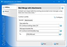 Keywords: free, freeware, outlook, add-in, add-on, send, messages, attachments, pdf Free tool for sending personalized email messages using fields from CSV data table and any data sources. The utility performs a Mail Merge, creating personalized email messages, using a template, your contact base, and specified attachments. As an email template, you can use the files of standard Outlook formats: OFT or MSG. Such templates can be created directly in Outlook in the form seen by the recipients. The data source for mailing is a standard CSV spreadsheet file. You can create this table in Microsoft Excel or another program, working with tabular data and contact databases. Location for attachments is specified in the table or in the program settings. The utility allows you to use the template attachments. With this, you can send different or the same files to many recipients and combine both cases. Unlike standard Microsoft Word mail merge tools, our utility provides a lot more features; it is faster and easier to use. You can use fields from a data table anywhere in a message: from the recipient addresses (including CC and BCC) to subject and message text. The utility provides the ability to select an Outlook account and the sender's address, distribute the sending time, limit selection of rows from the data source, combine template and table data, and a great deal more. This utility is a safe and reliable way to work with mass mailings. After configuring the tool, you can easily create outgoing messages in a specified Outlook folder, without sending them. Here, you can see email messages exactly as they will be delivered to your recipients, making sure everything is in order. You can immediately send emails using the "Redirect Messages" utility. You can also run the Mail Merge again, sending messages right away.