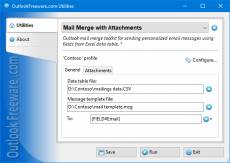 Keywords: free, freeware, outlook, add-in, add-on, send, messages, attachments Free tool for sending personalized email messages using fields from CSV data table and any data sources. The utility performs a Mail Merge, creating personalized email messages, using a template, your contact base, and specified attachments. As an email template, you can use the files of standard Outlook formats: OFT or MSG. Such templates can be created directly in Outlook in the form seen by the recipients. The data source for mailing is a standard CSV spreadsheet file. You can create this table in Microsoft Excel or another program, working with tabular data and contact databases. Location for attachments is specified in the table or in the program settings. The utility allows you to use the template attachments. With this, you can send different or the same files to many recipients and combine both cases. Unlike standard Microsoft Word mail merge tools, our utility provides a lot more features; it is faster and easier to use. You can use fields from a data table anywhere in a message: from the recipient addresses (including CC and BCC) to subject and message text. The utility provides the ability to select an Outlook account and the sender's address, distribute the sending time, limit selection of rows from the data source, combine template and table data, and a great deal more. This utility is a safe and reliable way to work with mass mailings. After configuring the tool, you can easily create outgoing messages in a specified Outlook folder, without sending them. Here, you can see email messages exactly as they will be delivered to your recipients, making sure everything is in order. You can immediately send emails using the "Redirect Messages" utility. You can also run the Mail Merge again, sending messages right away.
