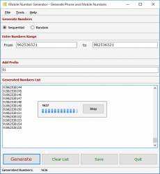 Keywords: number generator, sequence number generator, random mobile number generator, mobile number, random sequence generator, indian mobile number, us mobile number, random number generator excel Mobile Number Generator generates mobile phone numbers of any digits and any country. It can generate numbers of any number digits (UPTO 12 DIGITS). It can generates mobile numbers in SEQUENCE or RANDOM. This tool is a very fast mobile number generator and very easy to use. Generated mobile numbers can be saved in .CSV (EXCEL) format or in Text (.TXT) file format. Key Features are: 1. Mobile Number Generator generates number in sequence or in random. 2. Mobile Number Generator Generates mobile numbers of any number of digits (991-991-4756, 9910829374, 93281726356 etc). 3, Mobile Number Generator is very fast and efficient tool for generating mobile numbers of any country. 4. Mobile Number Generator is very easy in use. 5. Mobile Number Generator you can save generated mobile numbers in Excel or Text file Essential tool to generate numbers for Telemarketing or SMS sending.