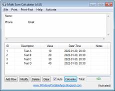 Keywords: calculator, Calculus, math, office, sales, windows 11, windows 10, PortableApps, PortableTools Multi Sum Calculator is a portable tool that calculates the sum of multiple values! Each value may have its respective Description, Date\Time and Notes! A print option is also available and users can customize the print layout to their liking! Multi Sum Calculator is a portable tool, thus, it demands no installation at all and it can be executed from any storage device on the go! (Pen Drives, SD cards, etc)
