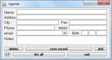 Keywords: Agenda, Address, Phone, Dial, Languages My personal Agenda - This is an address and phone agenda, with phone list, birthday listing, search all, automatic phone dialing and several options. This is the one I use and always have used for my own addresses and phone book. It was first created in Aurora basic (anyone remember?) many years ago, and then re-made in C and some years later in Delphi. Has basic suport for 3 languages, and if you would like to have any diferent one included, please email me with the translation for all the menus and button captions, and I will be glad to update it.The (about) button is a component for Delphi created by myself as I could not find a realy simple one for this - IE like -. If anyone wants a copy, please fell free to email me.