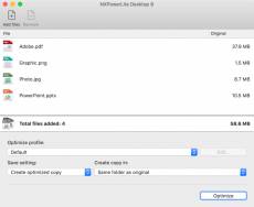 Keywords: file compression, compresser pdf, compress pdf, compress word document, pdf compressor, compress pdf file, reduce pdf size, reduce pdf file size, compress files, compresser un fichier pdf, compression software, compress powerpoint, compress word NXPowerLite will compress PDF, JPEG, PNG, Tiff, Microsoft PPT Word & Excel files simply and effectively, making them easy to email as attachments. It is especially effective on files that don't zip well. Optimized files stay in the same format - a PDF remains a PDF. It will look and feel identical to the original, just much smaller. You can optimize and automatically attach files to a new email by selecting the files and using 'Optimize and email' in Finder. One key for Mac or Window-Registration keys for NXPowerLite Desktop will work with either the Mac or the Windows version, so if you switch platforms you can keep using NXPowerLite. It also means if you are buying multi-user licences you don't need to specify how many of each platform you want up front.
