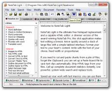 Keywords: text, html, editor, text editor, html editor, notepad, notetab, free, freeware, web, tabs, autocorrect, search and replace, programmable, regexp, perl, gawk, scripts, mac, unix NoteTab Light is the ultimate free Notepad replacement and a capable HTML editor. A slimmer version of the award-winning NoteTab Pro, this slick application makes text editing a breeze. Move quickly around a stack of large files with a simple tabbed interface. Format your text to your heart's content. Write with the font of your choice, fixed-width or proportional. If you need to cut and paste chunks from a pile of files, forget the Clipboard: you can set up a Paste Board file to save text clips automatically. Strip HTML tags from your files. Call up complete document statistics instantly. Use powerful, system-wide search and replace tools. Speed up your work with text macros: you can use them as shortcuts, or even to auto-replace those persistent typos. Handy sample macro libraries are supplied, and you can easily build your own. Make the most of NoteTab's many options to suit your own workstyle. There's more, much more, in this package -- try the finest piece of freeware available today!