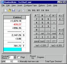 Keywords: calculators, arithmetic, scientific, adding machine, tapes, edits, prints, fractions, times, hours, minutes, seconds, running total, group total, grand total, item count, links, editable tape, memory, unit conversion, powers, roots, expressions NumberMate is an arithmetic and scientific calculator, adding machine, and time calculator that records and documents your calculations on multiple tapes which you can edit. It also performs unit conversion and arithmetic expression evaluation directly on a tape. Use it to (1) make simple everyday calculations, (2) organize and work simultaneously with several separate but related calculations, (3) make and record complex sets of interrelated calculations, (4) verify, revise, and reuse your calculations, (5) document your calculations for future reference, and (6) communicate them to other people. Type directly onto a tape. Record calculations the same way you would write them on a sheet of paper. Edit tapes anywhere, anytime by typing over the tape contents. Change, insert, delete, annotate, sort numbers. Cut, copy, paste tape lines, tape sections, entire tapes. Use links (like spreadsheet references) to automatically copy the total from one calculation into one or more other calculations whenever that total changes. Embed calculations within calculations. Store calculation results in a table. Show a running total, group totals, grand totals, item counts. Exchange columns of numbers with other programs via the Clipboard. Print a tape to a printer, an Internet Document (htm) file, or a Microsoft Word Document (doc) file - (requires Word 97, or a later version, installed on your computer). Save tapes to a file. Open and work with more than one file at a time. Use up to 20 tapes per file to organize separate but related calculations.