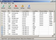 Keywords: open ports, tcp ports, udp ports, port scanner, trojan, malware, process, security, netstat, port monitor, network monitor, monitoring, remote, address This system utility monitors open TCP and UDP ports, connections and software applications that open these connections. It brings you an enhanced functionality of a similar tool that comes with Windows operating system: netstat. Open Ports Scanner in addition to the ports information available from your operating system, allows you to map an open port to the process ID running on your computer. You may easily catch spyware, malware and trojans when using this tool. Just search for suspicious TCP connections. You may instantly terminate unwanted connections right from this software. Monitoring features include TCP or UDP view filter and refresh speed timer. Full list of displayed data includes protocol name, process name, process ID, local port, local address, remote port, remote address and connection status. You may instantly close an open unwanted connection or export / print the list of open ports into a text file for future research. Fully supports IPv6.