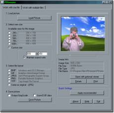 - simple four-step workflow - easy 'Apply recommended' option to make it even more user friendly - works with single files as well as with multiple files all at once - option to convert between graphics formats (.bmp, .gif, .jpg, .png, and .tif) - can be used to create thumbnails (takes one move on a slider) - smart ratio calculation (image proportions can be overruled by the user) - EXIF support, JPEG compression, TIFF compression, DPI settings - Runs on Windows 98/ME/NT4/2k/2k3/2k8/XP/Vista/7/8