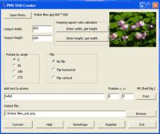 Keywords: jpg to png, bmp to png, gif to png, tif to png, ico to png, exif to png, wmf to png, emf to png, animation to png PNG Still Creator is a program which is intended for creating the PNG format pciture with high quality. It supports *.BMP, *.GIF, *.JPG, *.TIF, *.ICO, *.EXIF, *.WMF, *.EMF graphic formats. The png creator can resize the original photo's width or height by the convenient calculator to keep aspect ratio. With the creator, you can rotate the picture by different angles. You can also make the picture flip horizontal or flip vertical with one mouse-click. Various texts watermarks can be applied to any position of your picture. A frame of animated picture can also be converted to a png file through the creator.