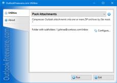 Keywords: free, freeware, outlook, add-in, add-on, attachments, zip, messages, contacts, calendars, journals, tasks Free and easy-to-use tool to pack attachments in Microsoft Outlook. Fast and safely compresses attachments in messages, contacts, tasks, calendar and journal items. Packed attachments reduce the size of PST / OST storage files and improve Outlook performance. Compressed attachments in mailboxes and Exchange Server public folders speed up message loading process and increases the overall messaging system efficiency. Working with attached archives provides more features: ability to open blocked attachment types is just one of them. Placing executables inside the archives eliminates the possibility of accidental .exe launches. The utility packs attachments to ZIP archive and removes original files from Outlook elements. Several attachments can be compressed to the one common ZIP file or to a separate archive for each of the attachments. Attachment name patterns can be specified for selective compression. For instance, only Microsoft Word documents can be packed by specifying *.doc* pattern. Tight integration with MS Outlook enables packing attachments of selected elements, folders or even whole storages. Standalone launcher allows to compress attachments without need to have Outlook running.