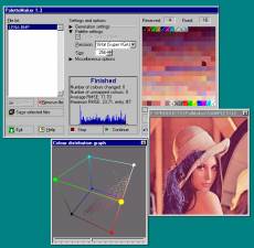 PaletteMaker creates a common 256-colour palette from a list of RGB pictures. It uses an iterative and interactive procedure in order to optimize those colours that you judge most important. PaletteMaker is flexible and achieves high quality palettes. PaletteMaker knows about the peculiarities of the Windows Palette Manager and the limitations of low-end graphic hardware. Furthermore, it takes the human perception model into account. PaletteMaker combines palette generation with dithering in a way that optimizes the palette for the presence of dither.