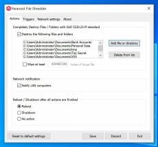 Keywords: Paranoid File Shredder, unwiderrufliche Datenlöschung, DoD 5220-22.M Paranoid File Shredder ist nicht nur ein Programm zur sicheren Entfernung vertraulicher Daten wie viele andere. Sein einzigartiges Merkmal besteht darin, dass er seine Arbeit verrichtet, ohne dass Sie vor dem Monitor stehen müssen. Es gibt drei Arten von Ereignissen, die den Löschvorgang starten: - Benachrichtigungen über LAN - Start eines spezialisierten Programms - Klicken auf Tastenkombinationen Das bedeutet, dass Sie bei Bedarf die Entfernung sensibler Daten von jedem Computer in Ihrem lokalen Netzwerk auslösen können. Und jeder Computer startet den Löschvorgang und teilt dies den Computern im Netzwerk mit, mit denen er verbunden ist. Wenn ein Alarm ausgelöst wird, löscht Paranoid File Shredder Daten mit der DoD 5220-22.M.-Datenlöschmethode. Wenn das Programm beendet ist, kann es den Computer neu starten.
