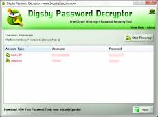 Keywords: Digsby password recovery, Digsby password, Digsby password crack, decrypt Digsby password Digsby Password Decryptor is the FREE software to instantly recover stored account passwords from Digsby Messenger. Digsby is one of the popular instant messenger of recent times with IM client, Email Notification & Social Networking all in one software. Digsby has a multi protocol IM client that lets you chat with all your friends on AIM, MSN, Yahoo, ICQ, Google Talk, and Jabber with one buddy list. Here are the key features * Instantly decrypt and recover stored encrypted passwords by Digsby. * On successful recovery operation, messenger account type, username and password is displayed. * Right click context menu to quickly copy the Password. * Backup the recovered Digsby password list to HTML/XML/TEXT/CSV file * Easy and faster to use with its enhanced user friendly interface. * Integrated Installer for assisting you in local Installation & Uninstallation. Digsby Password Decryptor works on most of the Windows platforms starting from Windows XP to new Windows 10 version.