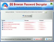 Keywords: qq browser password, qq browser password recovery, find qq browser password, qq browser password tool, recover qq browser password, lost qq browser password, qq browser password QQ Browser Password Decryptor is a free software to instantly recover all your website login passwords from QQ Browser It automatically detect the default QQ Browser profile location and displays all the stored login passwords in clear text after decrypting them. Another useful feature of this tool is the Save option which can be used to save the login secrets to the local file in standard HTML/XML/Text/CSV format. QQ BrowserPassword Decryptor works on wide range of platforms starting from Windows XP to new Windows 10 version. Now you can recover ALL your passwords from 15+ browsers, Download PRO Edition now https://xenarmor.com/browser-password-recovery-pro-software/