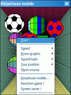 Perpetuum mobile los momentos culminantes moviendo continuamente y rodando las pelotas. A a 500 pueden mostrarse las pelotas una vez. El movimiento de la pelota puede seleccionarse para seguir la gravitación gobierna o se manipule impulsivamente. La posición del espectador puede ser la pantalla, el medio del cuarto, en una pelota, o en un ascensor. Por la presente los efectos visuales especiales vienen a la validez.