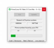 Keywords: Prime core, prime, number, benchmark, solid, prime number, stability test, stabilty, test June 2019 - Prime Cores Beta 6.1 Written for Microsoft Windows for testing the stability of your overclocked system. Based on proprietary multitasking prime number searching algorithm capable to find over 16 milion prime numbers less than a minute. The result of the operations is known as 16.980.364 and 16.977.548 prime numbers for 6+6 cores and must coincide with the final result provided by the CPU under test.