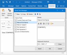 Keywords: Outlook, Add-in, Addin, Addon, Add-on, Hotkeys, Shortcuts, Tweaks, Notes, Comments, Folders, Templates, Reports Outlook add-in for inserting email text blocks instantly. Insert greetings, signatures, standard responses, and other commonly used template phrases. Spend less time emailing: - Insert ready-made text blocks with just two clicks. - Use keyboard shortcuts to insert ready-to-use snippets with one touch. - Add attachment lists to your messages: avoid forgetting about any of them and avoid typos. - Insert the current date and time into Outlook emails. - Use the familiar formatting options: change the font, its color, and styles. - Create new templates from old ones by copying them. - Arrange the template list automatically in alphabetic order or manually in the order you prefer. - Don't limit yourself - Quick Text supports any number of templates. To deal with Outlook messages, tasks, calendar items, etc. more productively, simply create a set of templates you need. After that, you can insert ready-made text blocks by selecting them using a couple of keyboard or mouse clicks. Additional program abilities allow you to insert changeable data, such as attachment lists or the current date and time. Whether you are a support assistant, sales manager, or just an intensive email user, Quick Text will save many hours of your precious time writing and correcting the same text blocks.