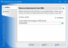 Keywords: free, freeware, outlook, add-in, add-on, eml, attachments, delete This free utility removes attachments from email message files in EML format. It allows you to remove unwanted attachments from EML files, such as viruses, executables, photos, videos, audio, or duplicate files. The tool preserves the original formatting and any additional message data, such as the sender, recipients, and Internet transport headers. If you need to keep the original EML files with attachments, the utility can move them to a separate folder. To save attachments before deleting, use another our utility. Key benefits of the utility: - Can delete attached messages, contacts, appointments, meetings, tasks, notes, and other Outlook items. - Can remove hidden and embedded attachments. - Allows you to filter attachments by name, extension, size of attachments, and message dates. - Creates a list of removed attachments and attaches it to the EML file. - Supports any EML file formats used by popular mail clients, like Windows Mail, EarthLink, Windows Live Mail, Thunderbird, The Bat, and others. - Provides additional application to remove attachments from the command line that can be used to batch delete attachments from EML files in different folders. - There are no restrictions on the size or number of EML files being processed. - Privacy: You need not upload messages to third-party online services. When using the command line, you can automate the removal of attachments from EML files and schedule the removal process.