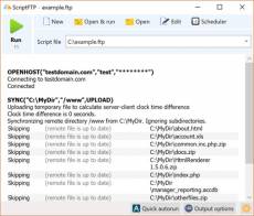 Keywords: script FTP, FTP, batch FTP, script, automated FTP, unattended, synchronize, batch ftp, secure FTP, SFTP, SSL FTP, automated SFTP ScriptFTP is a FTP/FTPS/SFTP client designed to automate file transfers. It follows the commands written on a text file (also called script file) and make the transfers automatically. Writing the script file is very easy and once written you can run them with just a single click. Script scheduling is also supported. ScriptFTP is a script-driven FTP client. It works like traditional FTP clients but does not require any user interaction while running, instead it works automatically using a text file which contains the actions ScriptFTP has to execute. Let us consider a simple script: OPENHOST('ftp.myhost.com','myuser','mypassword') GETFILE('myfile.zip') CLOSEHOST