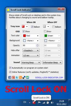 Keywords: scrolllock, scroll lock, scroll, keyboard, indicator, software Many laptops and wireless keyboards either don't have any indicator for Scroll Lock or have it located in an inconvenient or hidden place, under a hand for example. So knowing the actual state of Scroll Lock, especially after accidental key pressing is a huge problem! Scroll Lock Indicator software offers two Scroll Lock state indicators: Tray Icon and On-Screen Floating Text. Notifications by sound are also available. Moreover, sound alerts can be different for On and Off states. The product is distributed on the Try Before You Buy model with 30-day trial period. The license costs $2.95 per computer or user. There is a volume discount.