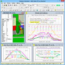 Keywords: 3D, Parametric CAD, Shading Analysis, static PV-systems, Solar Energy Engineering To decide which the product Shadow Calculator or Shadow Analyzer corresponds to your needs, remember that Shadow Calculator works with static PV-systems like plane panels of PV-modules on a roof or rows of inclined PV-modules on the ground, while Shadow Analyzer analyses also the sun-tracking PV-systems with panels of PV-modules installed on 1-axis and 2-axes trackers. Both the products allow you to create the 3D model of your solar project in the particular architectural environment of your site, and then visualize shadows on your solar collectors for different days and seasons to error-proof your project (to make sure whether it is really free of shadows for the most daytime hours). You can also transfer 3D views of the project into other applications like MS Word or MS PowerPoint to write an illustrated report or to prepare an animated presentation for a lecture. For solar professionals, both the products are also good marketing and presentation tools for the negotiations with clients. The '3D View' windows highly improve the impression from your project proposals, make them more consistent and clear for your clients, and assure your clients in the reliability of your project. In addition to visualization options, Shadow Calculator and Shadow Analyzer provide you with various forms of the graphical and numerical information concerning your project. They allow you to specify the climatic parameters of your site for energy calculations. They display the calculated characteristics of the shading, energy losses, and the energy output of your system in several 'solar' windows for a particular day or the entire year. You can analyze the graphical representation of the data (displayed as a set of curves of the calculated characteristics), or use the Table window that displays their numerical values in tables. Then you can transfer the tables into other applications like MS Excel to compare data of different versions of your project.