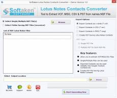 Company: Softaken Country: United States of America, Florida, St Augustine ASP member: No Company Web site: http://www.softaken.com/ Application info: http://www.softaken.com/lotus-notes-contacts-converter Author: Smera Smith Sales email: pad@softaken.com Support email: pad@softaken.com License type: Shareware Class: System Utilities::File & Disk Management Specific: Categories: Utilities :: System Utilities, Utilities :: File & Disk Management, Email :: Mailing List Tools, Email :: Clients, Communication :: E-mail Platform: Windows OS: Win2000, WinXP, Win7 x32, Win7 x64, Windows 8, Windows 10, WinServer, WinOther, WinVista, WinVista x64 System requirements: Pentium II 1 Ghz, 1GB RAM, Minimum 512 MB Space Language: English Limitations: Convert only first 10 contacts