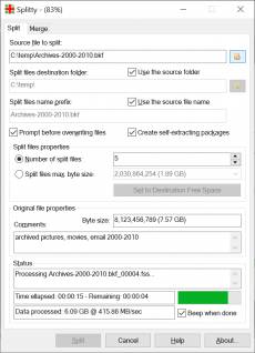 Keywords: Basta, Computing, Splitty, file, splitter, split, break, self-extracting, divide, backup, merge, cut, archive, join, 4GB, floppy, huge, resume, disk, utility, utilities, tools, shareware, windows, 2000, xp, vista, 7, software, download Files have been growing in size at an impressive rate. Between movies, music, presentations and databases, we often find ourselves struggling to e-mail, ftp or back up large files. Splitty enables you to reliably divide large files into smaller manageable files that can be easily transferred over the Internet, or stored on DVDs, CDs, USB flash drives and other modest storage media. Splitty is not just another file splitter, it has been optimized for performance, security and reliability. Splitty uses a checksum algorithm to insure data integrity and breaks the 4GB barrier to let you split files of virtually any size. A self-extracting feature is also included to facilitate the distribution of split files and recover the original file without Splitty. Drag the files you want to split from Explorer and drop them onto Splitty, then click on the split button and leave the rest to Splitty.