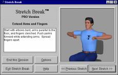 Keywords: RSI, ergonomic, stretch break, stretching, exercise, break reminder software, Yoga, carpal tunnel, workplace, ergonomic equipment, occupational health, Smart Timer, fitness, stress, strain, Windows program, home office, hands, back, neck Stretch Break is an ergonomic software program that helps prevent Repetitive Strain Injuries (RSIs) by gently reminding you to take periodic breaks while using your computer. Every 30 minutes (default) it asks your permission to show yoga-based stretches. Full-motion animated figures show you how. Then Stretch Break returns you to your current Windows application. Stretch Break is simple to install and use. With one mouse click, you begin stretching with the on-screen figures. Select how long to wait between stretch sessions and how many stretches per session. Choose sequence and duration of stretches. Select the Standard Timer or the Smart Timer which monitors keyboard and mouse activity to determine the time to the next break. Plays music during breaks. Site licenses are available. Stretch Break was designed by a team of health care professionals who carefully reviewed each stretch in the program. Stretches focus on parts of the body most likely to be harmed by RSIs including the neck, arms, hands, back, legs, and wrists. Also, includes eye exercises. The current version, 6.6 contains 42 stretches. Several focus on stretching the muscles associated with Carpal Tunnel Syndrome. Includes Healthy Computing module with workstation setup guide. Network compatible. Site licenses available. - Visible countdown timer - 'Bring it Home' licensing - Allows on-the-hour and half-hour timer - Simple to install and use - Reminds computer users to take periodic breaks - Asks your permission to show the stretches - User controls time between stretch sessions - Smart Timer Option - Full motion color animations - Allows users to select stretches and sequence - Administative module tracks use patterns - Includes workstation setup guidelines - Research proves that it works - Call Center Option - Yoga-based stretches