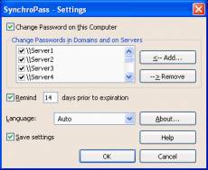 Keywords: password, security, synchronize, network, management Most of Microsoft Windows operating systems give an opportunity for user to change domain password from his/her computer, but only in case both the computer and user account belong to this domain. If the computer can't join a domain (in particular, if there is 'Home' Windows edition installed), if there are multiple domains, or in peer-to-peer network the user is forced to ask network administrator to change network passwords. SynchroPass can solve this problem. It allows to synchronously change passwords for current user account on local computer, in one or several domains, and on one or multiple peer-to-peer servers. The program also can inform user about passwords expiration and invalidity. SynchroPass can be used on systems with Microsoft Windows NT 4.0, 2000, 2003, 2008, 2008 R2, 2012, XP, Vista, 7 or 8 operating system installed. Both 32- and 64-bit OS versions supported (but the program itself is 32-bit). SynchroPass can not be used on Windows 9X computers. Also it can't change passwords for shared network resources on Windows 9X servers. SynchroPass doesn't require administrative privileges to run. To run in Windows NT 4.0, installation of Service Pack 6 required. SynchroPass supports multiple languages. Currently installation package includes support for English and Russian. Support for additional languages may be added in future in form of add-in packages.