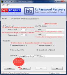Keywords: 7z password recovery, unlock 7z file, open 7z file password, 7 zip file password recovery, recover 7z file password, recover 7z password, 7 zip password cracker, 7z password unlocker Any 7z/7zip user should make use of smart tool like SysInspire 7z Password Recovery Software if they have tendency to encrypt their 7z file archive. This 7 ZIP file password recovery tool has three diverse algorithms to recover 7z file password. These includes: Brute Force Attack, Mask Attack, and Dictionary Attack. The most chosen option among all password recovery methods is Brute Force Attack. It has the capacity to recover 7 z file password of n number of characters in the password string. User has the facility to opt for multiple types of character sets (lower case alphabets, upper case alphabets, special characters, numbers, etc.) in one go. ). If a small part of 7z password is known then do the process to open 7z file password can be quicken up with this 7 ZIP Password Cracker with Mask Attack. The 7z Password Unlocker is available with uncomplicated and single panel graphical user interface which makes a sense of familiarity for a non technical. User can select any method to unlock 7z file. Character set of the password is not a restriction as it supports UNICODE character set and password in any language (with any printable character). A copy can be saved in clipboard after the procedure to recover 7z password. It can be used for free to crack 7zip password in the form of demo version. This edition will allow user to restore first three characters of the password. Hence keep SysInspire 7zip password recovery tool to recover lost 7z password with any variant of 7z or 7zip file.