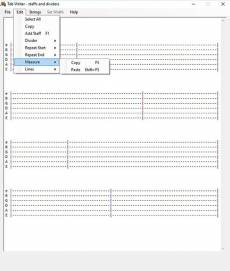 Keywords: guitar tablature creator, bass tablature creator, tablature creator, tablature Tab Writer 5 Free Tablature Software Designed to easily write tablature for four, five, six, seven, twelve string as well as custom instruments and tunings. Tab Writer allows you to save, edit, and print your tablature. Tab Writer, tab writing software for windows 7, 8, and 10 was created as an alternative to writing guitar and bass tablature using a text editor. New Features In Version 5.2.0 User changeable number of lines at the top and between staffs on the tablature sheet. Tab Writer 5 has additional options for custom string arrangements and tunings. Definable tablature staff widths, repeat indicators, and the ability to copy and paste measures. Tab Writer has an online help file, and is now available as a free download. We hope you enjoy using this software, and we are open to suggestions for additional features.