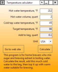 Keywords: home brewing, diy beer, beer making, beer brewing TempCalc was written with home brewing in mind. During the DIY beer making process, you may have to mix hot water with cold to arrive at a predetermined temperature that is cold enough so it will not kill yeast, yet warm enough to aid fermentation. The calculator can suggest the amount of cold water that must be added to boiling wort. This program was written to aid readers of How To Never Run Out of Beer, the home brewing handbook on Amazon: https://www.amazon.com/How-Never-Run-Out-Beer/dp/B08LNLBY8C/ref=sr_1_1?dchild=1&keywords=Never+run+out+of+beer&qid=1603668816&s=books&sr=1-1 although it can be used for other purposes when liquids of differing temperatures must be mixed.