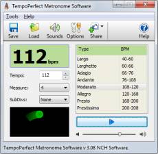 Keywords: metronome, beat, digital metronome, electronic metronome, beat keeper, time keeper, tempo, allegro, presto, computer metronome, metranome, meteronome TempoPerfect is a free software metronome. Unlike mechanical metronomes, our software metronome provides a clear and precise beat that won't wind down, making it an essential tool for any musician. Designed to help musicians play in time, TempoPerfect creates beat patterns using a combination of accented beats and normal beats. For example, you can have 3+2 timing, or X-x-x-X-x visually. The bars first beat can also be emphasised by a unique sound. TempoPerfect features a visual beat indicator bar that bounces from left to right in time with the beat. This provides musicians with a very helpful visual cue. For those of us who cannot remember the correct bpm for a particular speed (eg. Allegro), TempoPerfect also includes a tempo guide in the main window. Features: * Highly accurate beat simulation. * Will not wind down like mechanical metronomes. * Allows beats to be sub-divided into accented beats and normal beats. * Beat indicator bar provides helpful visual cue. * BPM Tempo Guide chart for each speed of music (eg. Allegro = 120 - 168). * Simple and intuitive interface. * Download for free.
