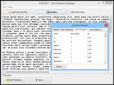 Keywords: text, edit, editor, analyzer, analysis, txt, statistics, stats Analyze statistics on your character, word, and line frequency with the help of this lightweight software utility that could prove quite handy in linguistics studies. The GUI packs two main buttons, one allowing you to load your text from a file, with the other initiating the analysis itself. However, you can also simply paste your text in the main window, take a look at it and even make modifications if you consider them necessary. As for the statistics the software utility provides you with, they are offered in a new window that is organized into several tabs. The General section informs you about the total number of characters, words, and lines, as well as how many unique elements were employed in your text. Whats more, character, word, and line frequency can be interpreted as well, with each item being associated with details regarding the number of instances it appeared in your text. Besides, the frequency is also expressed in percentage points in order to have an overview of your linguistic habits. Plus, in case you consider it is more comfortable to explore the results of your quest in a CSV file, you can do that as well, with a button at the bottom of this second window allowing you to export all the data.