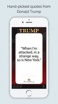 Keywords: donald, quotes, politics, election, republican, huge, great, drumpf, america, president, trumped, democrat, trump Love him or hate him, Donald Trump surely says a lot of memorable things! This free app offers hundreds of hand-picked publicly available quotes from the man himself. Get a new quote delivered to your phone automatically every day! Sources include many public interviews, campaign speeches, the @realDonaldTrump Twitter feed, and even excerpts from some of his very own books. This app is free but ad-supported. If you wish, ads can be removed through a simple in-app purchase. FEATURES: - Hundreds of Trump quotes, updated regularly. - Quickly love or hate a quote on Facebook. - Share quotes easily with any other service, including as a text message, Twitter, and more. - Get the quote of the day in the Today Widget, or on your Apple Watch. - All quotes are indexed in Spotlight and available for search on your device. DISCLAIMER: This application is not affiliated with nor endorsed by any political campaign, candidate or political action committee.