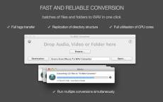 Company: AMVidia Country: United States of America, Utah, Provo ASP member: No Company Web site: http://amvidia.com/ Site of program: http://amvidia.com/wav-converter Application info: http://amvidia.com/wav-converter Author: Nick Kozlov Sales email: sup.amvidia@gmail.com Support email: sup.amvidia@gmail.com License type: Shareware Class: Audio & Multimedia::Rippers & Converters Specific: Categories: MP3 & Audio :: Converters, MP3 & Audio :: Rippers & Encoders, MP3 & Audio :: Utilities and Plug-Ins, MP3 & Audio :: Music Management Platform: OS: Mac OS X, Mac Other, Other System requirements: MAC OS X 10.7 or later, 64-bit processor Language: English Limitations: Limited duration of output WAV files.