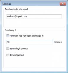 Company: Topalt.com Country: United Kingdom, NA, London ASP member: No Company Web site: http://www.topalt.com/ Site of program: http://www.topalt.com/outlook-send-reminders Application info: http://www.topalt.com/outlook-send-reminders Author: Topalt Info Sales email: pad@topalt.com Support email: pad@topalt.com License type: Freeware Class: Business::Office Suites & Tools Specific: Categories: Outlook, Office, Email, E-mail, Business, Windows Platform: OS: WinXP, WinVista, WinVista x64, Win7 x32, Win7 x64, Win2000, WinServer, Windows 8 System requirements: Microsoft Outlook 2000, 2002 (XP), 2003, 2007, 2010 or 2013 (32 and 64 bit versions). Language: English Limitations: No limitations.