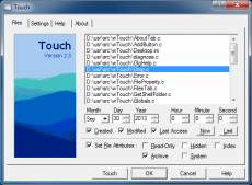 Keywords: Touch, time, data, file attributes, create, modify, access Touch is a small Windows freeware utility that will allow you to change file timestamps and attributes for selected files. Simply drag files from Windows Explorer file folders to the Touch window, or use the Explorer Send To menu. Touch includes facilities to modify the file Creation, Modification and Last Access timestamps as well as optionally setting file attributes including the Read-Only, Archive, System, Index and Hidden bits. A command-line console application is also included to provide the same facilities for command shell and batch scripts. Use Touch -? to display a help manual page describing all command line flags and options.Touch will run on windows Vista, 7 and 8 operating systems as well as Windows XP and 95/NT systems.