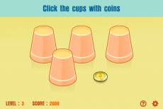 Beware of the tricky movements of the cups! In this game, your goal is to select the cups which contain coins after the positions of the cups are shifted. At the start of each level, the positions of the coins will be displayed for a few seconds. The golds will then be covered by paper cups, and the cups will start to move. Then you need to click the correct cups which contain coins in order to proceed. Remember to watch the movements of the cups carefully, as sometimes tricky shifts may occur, for example, only the positions of the cups are shifted but the coins are not moved. As you advance in the game, the number of coins will increase and the movements of the cups will become more complicated. Look through the disguises to reveal all of the golds!