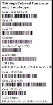 Keywords: universal barcode fonts, barcode fonts bundle The Universal Barcode Fonts Package is a single font in several height requirements that allows generation of barcodes in Code 39, Code 128, Intelligent Mail and others. The package also includes encoders that convert your data for barcode display in environments like Crystal Reports, Oracle, Excel, Access, SSRS, .NET, Java, Internet, and Email to name a few. Here are some other features: -Supports multiple languages with double-byte character sets such as Japanese, Chinese and Korean. -Multiple font types included such as Digitally Signed TrueType, OpenType, PostScript and PCL. -Supports AIM USS Code 128, GS1-128, EAN-128, Code 39, Code 93, Interleaved 2 of 5, MSI, Codabar and USPS Intelligent Mail (IMb). -Developer License versions include silent installers, source code, Developer Tools, custom modifications and web fonts in WOFF, EOT and SVG formats. -Easy function encoding for returns, tabs and more in Code 128. The Universal Barcode Fonts Package is available in a variety of license options to meet any usage scenario. There are a range of options for single users, multi-user environments, and Developer Licenses for use in more complex or commercial environments. Developer License versions include Developer Tools for environments like Java, .NET, SSRS, .NET Standard and others. IDAutomation offers a free demo for testing the Universal Barcode Fonts Package before purchase. The demo version does not include encoders for complex environments like Java, .NET, or SSRS.