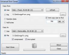 Keywords: Disk, Disc, Cloner, Cloning, Wiping, free, freeware, tool Universal Disk Cloner is as simple as possible disk cloning, imaging and wiping tool. Works on Windows XP and up (32 or 64 bit). Program is freeware and portable. Requires no installation. With this tool you can make precise copy of your old disk to the new one. You can clone disk to disk, disk to file, file to disk or wipe entire disk with zeros or random data. Program supports compression for saved image files. You can protect saved image files with AES-256 encryption. NOTE THAT this program does not work with partitions. It clones/wipes entire physical disks. Program clones disks regardless of used file systems, so you can clone disks with FAT32, NTFS, EXT2/3/4, ReiserFS, XFS, JFS or any other file system you can imagine. Program supports disk with unlimited size. You can work with any device mapped to your system as fixed or removable that supports low level disk access. You can use any hard drive, USB flash disk, SD card, virtual disk (VHD), etc. Even some ram disks can be cloned (read from and also write to). Program may clones all devices that supports .PHYSICALDRIVEx access. You can also clone larger disk to smaller one (of course without warranty that new disk will work same as the original). Programs is provided 'as is' without warranty of any kind. For more informations read INFO.txt. WARNING: program is designed for advanced users. If used inappropriately you can lose your important data! Use it on your own risk. In no event will the author be held liable for any damages arising from the use of this software. Before using the program read Disclaimer first. RECOMMENDATIONS: - You should run program with administrator rigths. - Before picking source or destination disk click on refresh button. - Destination disk should be of same size or more than source disk/file (it's not necessary but then result is without warranty). - You must ensure that there is enough free space at target partition or disk, mainly if compressed image file is used.