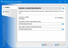 Keywords: free, freeware, outlook, add-in, add-on, attachments, links, messages, contacts, calendars, journals, tasks This free utility changes the location of the files in the linked attachments of email messages, contacts, calendars, tasks, and other Outlook items. The links remain in place as attachments - the utility only changes the location of the files to which they point. Replacing Outlook attachments with links is a convenient and easy way to free up space in your mailbox or Exchange Server public folders. After running the "Replace Attachments with Links" utility, file attachments are saved to the specified location and links are placed instead of them. Sometimes, you might want to move the saved attachment files to another location, for example, if you change your computer, rename the network share, or even change the drive letter or the name of the folder with attachments. This utility replaces the location of files in links to Outlook attachments. You just need to select Outlook folders, specify the old and the new location of the files, and then run the utility. The utility will replace the old location to the new one in all appropriate links. You can also limit the types of processed Outlook items and the date range. Command line allows you to centralize the movement of common file storages among many users, thanks to the ability to use the it in your scripts, batch files and other scenarios.
