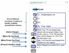 Keywords: Excel, Outlook, Word, port, copy, paste, export, import, convert, transfer, link, move, pass, convert, spreadsheet, SharePoint Web Part, Office, Office 365, 2013, app, finance, financial UpdateYeah!(TM) saves you time in preparing emails with data from Excel(R) 2013 or Word(R) 2013. It is simple, fast and effective when building emails with numbers, currency, dates, percentages, or any other data you are maintaining in spreadsheets or tables. When you maintain project information for the team, UpdateYeah! will simplify preparing the status emails you send to team members, management and customers. Your data may include historical data, backup data, audit data and details that are important to you but too much data to include in every status update email. Sending your Excel file as an attachment is information overload for your readers. Instead, choose the key data elements that benefit each team member and format that information into short concise sentences for the subject text and the body text. Use formulas to reference specific data values needed and eliminate having to edit each time you need to send another update. Tip: people pay more attention to emails addressed just to them, and doing so with UpdateYeah! is less work for you. The fact is many times individuals use cell phones to read emails which is another reason people do not open your Excel or Word files. Let's face it, what serves your team members well is short concise emails with only the latest data that pertains to just them. If this is your case then send an UpdateYeah! UpdateYeah! works in the Microsoft SharePoint(R) and Office 365 Web Part versions of Excel 2013 and Word2013. UpdateYeah! works on all Microsoft Surface(TM) tablets including the RT version. UpdateYeah! is a product of Ramplan.com. Email your comments, questions and feedback: updateyeah@ramplan.com.
