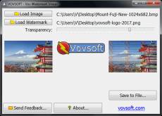 Keywords: watermark, image, photo, blend, blending Effortlessly add watermark to images in tiled mode using this tool with support for PNG, JPG, BMP, TIF and other filetypes. If you're looking for a simple solution for applying watermarks to photos in tiled mode, you can use Vov Watermark Image. It's a free tool with straightforward features that offers support for multiple filetypes. Vov Watermark Image gets installed quickly and without any issues. As far as the interface goes, the utility has a single window that shows all options available. By clicking two buttons, you can separately load the base image and the watermark picture. Both can be previewed in this panel, along with the new photo. Furthermore, you can tweak the level of watermark transparency while keeping an eye on the new photo preview, thanks to the fact that changes are reflected in real time. When you're pleased with the result, you can save the new photo by specifying an output directory, filename and format. Worth noting is that Vov Watermark Image acts as a graphic converter too since it can create photos with different filetypes than the originals. As far as file format is concerned, it works well with PNG (with or without transparency), JPG, BMP, ICO, EMF, WMF, TIF or TIFF.