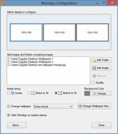 Features Add folders and images for a monitor Manage each monitor separately Resizing options for wallpaper images Set background color Shuffle the images or set in order