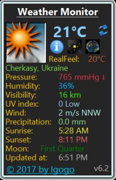 Company: Bushyn SOFTWARE Country: Ukraine, Krivy Kolina ASP member: No Company Web site: https://windows10gadgets.pro/ Application info: https://windows10gadgets.pro/weather/weathermonitor/weathermonitor.html Author: Igor Bushyn Sales email: shvaika@yandex.ua Support email: shvaika@yandex.ua License type: Freeware Class: System Utilities::Other Specific: Utilities Categories: Platform: Windows OS: Win2000, WinXP, Win7 x32, Win7 x64, Windows 8, Windows 10, WinServer, WinOther, WinVista, WinVista x64 System requirements: Language: English Limitations: