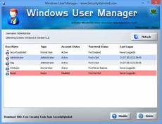 Keywords: user manager, user tool, manage users, windows user tool, enable administrator, delete user, disable user, windows user manager Windows User Manager is the free desktop tool to easily and quickly manage all the User accounts on your Windows system. On starting, it lists all user accounts along with following details for each user, # User Name # Account Type (Administrator/Normal User/Guest) # Account Status (Active/Disabled) # Password Status (Pwd Set/Not Set/Expired) # Last Logon Time You can select a user from the list then Enable/Disable or Delete that account with just a click of button. This will be useful in recent systems (win7, win8 etc) where built-in Administrator account is disabled by default and using this tool you can quickly enable it. Also it features Color based display for easier identification. Disabled user accounts are shown in red background color while Admin accounts are shown in blue color. It has cool GUI interface and very easy to use tool for all level of users. It is fully portable and does not require any other components such as .NET or Java. Windows User Manager works on both 32-bit and 64-bit systems starting from Windows XP to Windows 8.