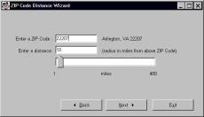 Keywords: zipcode, ZIP Code, database, mailing, marketing, sales, reference, distance, mileage, USPS The ZIP Code Distance Wizard allows you to locate ZIP Codes that are within close proximity of a specified ZIP Code. For example, let's say that you are a direct marketer and you want to send out a mass mailing to all addresses within a 50 mile radius of a particular ZIP Code. But how do you know what ZIP Codes are within a 50 mile radius of a specific ZIP Code? Or perhaps you are a sales person who obtains commissions based on sales that occur within a 100 mile radius of your office, and you need to know what ZIP Codes fall within that radius? This is where the ZIP Code Distance Wizard can assist you. All you do is type in a ZIP Code, specify the radius distance in miles, and within seconds, a list of ZIP Codes that fall within that radius is displayed. The ZIP Code Distance Wizard permits you to export or copy the results to either a comma separated value (CSV) file, or to the Windows Clipboard. Includes every 5 digit ZIP code in the USA. (42,000+ entries). The program is updated regularly so the data it contains remains current.