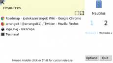 Keywords: productivity, desktop, window management, multi-platform, cross-platform, mouse, utility arrangeit is a cross-platform desktop utility that helps you placing your desktop's open windows. It is a utility mostly based on the mouse movements, with some keyboard shortcuts as helpers. Basic usage Move your mouse to set the future position of the window. You may change the active corner either manually, by pressing the Ctrl key on your keyboard, or dynamically through the snapping functionality (when a moving window snaps to some window with a side not connected to the currently active corner). By pressing the left mouse button (or by pressing the Enter key on your keyboard) you set the future position of the window and moving the mouse afterward resizes the main window. Press the left mouse button again to confirm the future size. To move the current window on another workspace you should press the wanted workspace number on your keyboard. As an alternative, you may first release the mouse by clicking the middle mouse button or by pressing the Shift key on the keyboard, and then click the wanted workspace box with your mouse. Click a window title in the listed windows area to start operating from some other window. Click the minimize/restore icon inside the title box to change the minimized state of the current window. Click the fixed/resizable icon if you want to change just the position of the current window, without changing its size (and vice versa).
