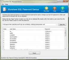 Company: iSunshare Country: China, GuangDong, ShenZhen ASP member: No Company Web site: https://www.isunshare.com Site of program: https://www.isunshare.com/sql-password-genius/ Application info: https://www.isunshare.com/sql-password-genius/ Video: https://www.isunshare.com/video-center/tutorial/video-sql-password-genius-tutorial.html Author: Elina Wu Sales email: admin@isunshare.com Support email: admin@isunshare.com License type: Shareware Class: Security & Privacy::Password Managers Specific: Categories: Utilities :: Password Recovery, Utilities :: Security & Encryption Platform: Windows OS: Win2000, WinXP, Win7 x32, Win7 x64, Windows 8, Windows 10, WinServer, WinOther, WinVista, WinVista x64 System requirements: Windows 2000/2003/2008/2012/2016/XP/Vista /Win7/Win8/Win10(32 bit & 64 bit), 512MB RAM or more Language: English Limitations: Trial version can display all user accounts on your SQL Server, but cannot reset the password